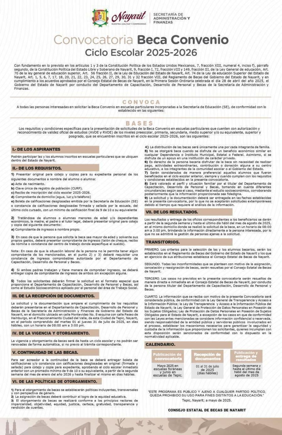 El Gobierno de Nayarit lanzó oficialmente la convocatoria de la Beca Convenio para el ciclo escolar 2025–2026, un programa que brinda apoyos económicos a estudiantes que cursan sus estudios en escuelas particulares del estado.