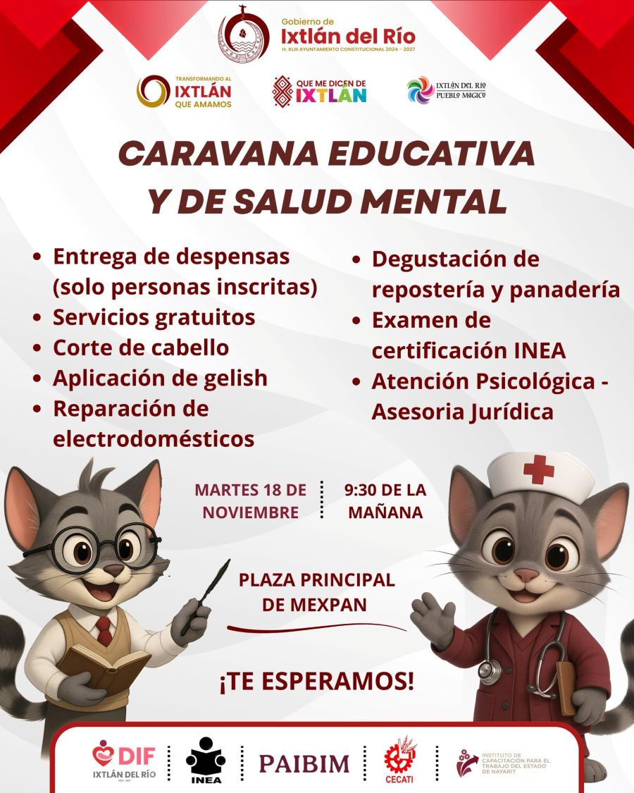 Corte de cabello. Aplicación de gelish. Reparación de electrodomésticos. Degustación de repostería. Certificación del INEA. Atención psicológica. Asesoría jurídica. Todo esto —y más— estará disponible este martes en el poblado de Méxpan, municipio de Ixtlán, como parte de la Caravana Educativa y de Salud Mental, impulsada por el gobierno municipal que encabeza Memo Ramírez.