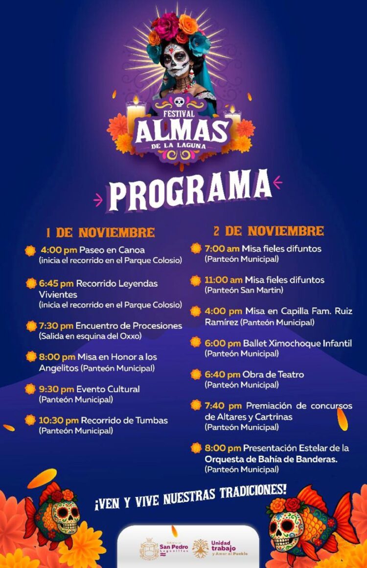 Entre las actividades destacan el paseo en canoa por la laguna, el recorrido de leyendas vivientes, misas en honor a los difuntos, presentaciones de ballet folclórico y obras de teatro, además de la esperada actuación de la Orquesta de Bahía de Banderas.