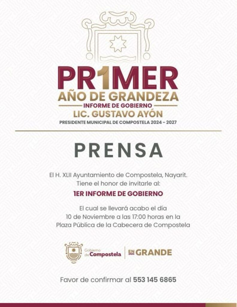 El presidente municipal de Compostela, Gustavo Ayón, anunció que será el lunes 10 de noviembre, cuando presente de manera oficial su Primer Informe de Gobierno, cumpliendo con lo que establece la ley.