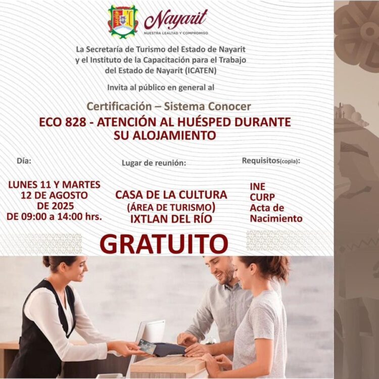 Con el objetivo de fortalecer el potencial turístico de Ixtlán del Río mediante el uso de herramientas digitales y un mejor servicio al visitante, la Secretaría de Turismo del estado impartirá dos importantes cursos de capacitación dirigidos a prestadores de servicios, emprendedores y ciudadanía interesada en el desarrollo del sector.