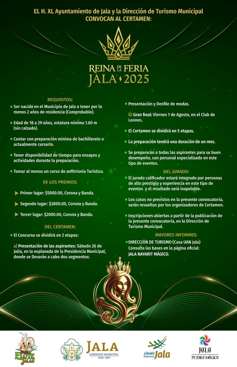 Las interesadas deberán contar con una preparación mínima de bachillerato y haber tomado, al menos, un curso de anfitrión turístico, como parte de los requisitos para participar. Todo esto con el objetivo de elegir a una Reina que no solo represente a Jala, sino también a su Feria del Elote 2025, que promete ser una de las más grandes y esperadas.