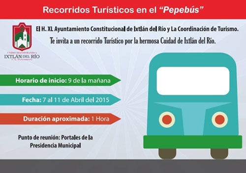 IXTLÁN DEL RÍO.- El Ayuntamiento que encabeza el licenciado José Antonio Alvarado Valera, a través de su Dirección Municipal de Turismo pondrá en marcha el programa de de recorridos turísticos durante la Semana de Pascua.